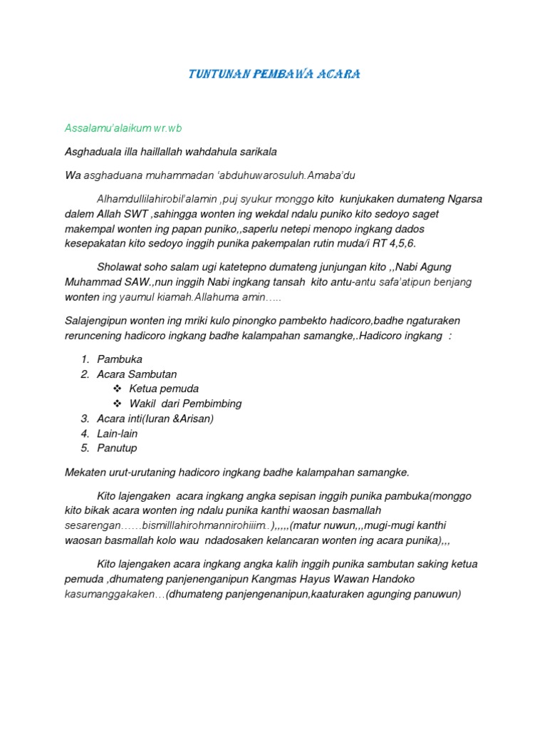 Teks MCPembawa Acara Wisuda hatam Al-Quran. Download Now Tk Islam Jakarta Taman Kanak Kanak Islam Taman Kanak Kanak. Contoh Susunan Acara Prosesi Wisuda. Karena biasanya wali murid juga akan memberikan sambutan pada acara tersebut. Contoh mc formal pembawa acara resmi khusus mc wisuda lengkap dari awal sampai akhir puji syukur hanyalah milik allah swtyang telah memberikan nikmat dan karuniah nya kepada kita sekalian sehingga pada pagi hari ini sabtu.